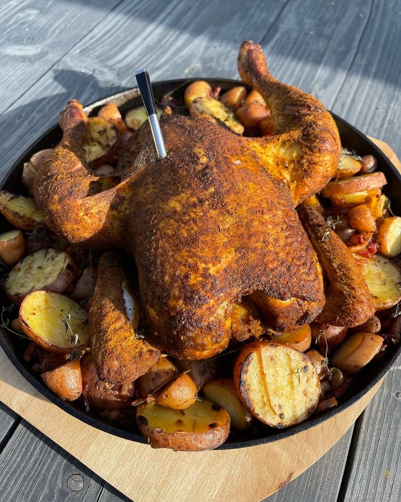 WHOLE BBQ CHICKEN WITH ROSEVAL POTATOES, FRIED ONION AND BACON