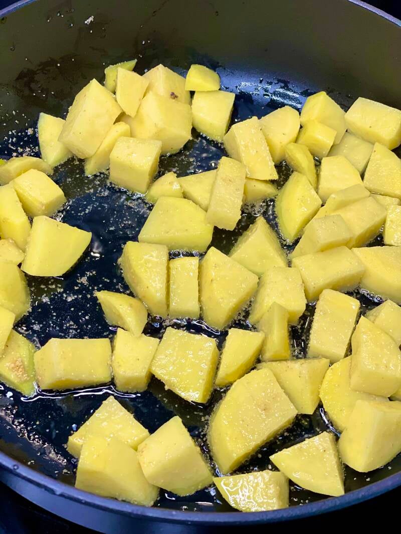 - Voeg de aardappelen toe en bak een paar minuten mee.