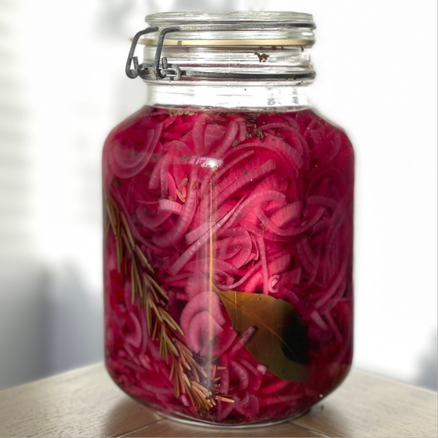 - Snijd de rode uien in fijne halve ringen en plaats deze in een weckpot.