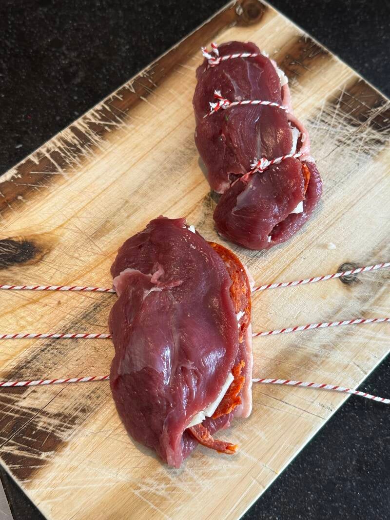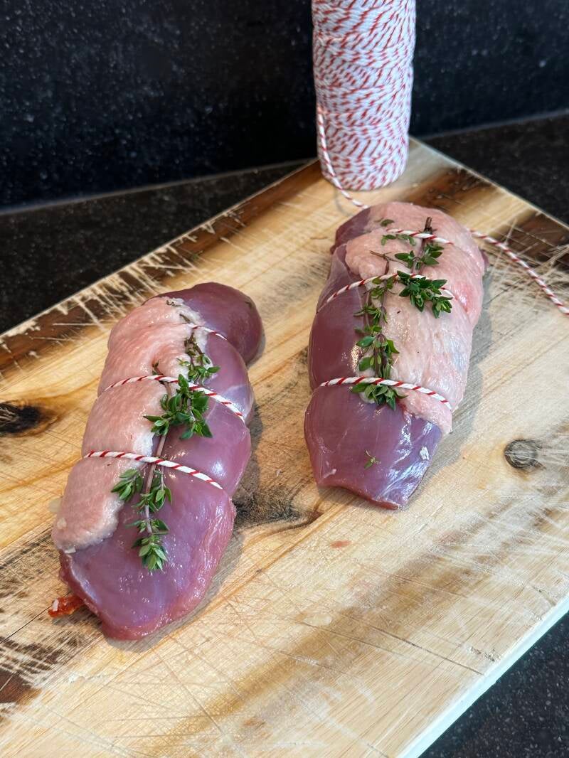 - Leg de touwtjes evenredig uit elkaar op een snijplank, leg hier nu wat takjes tijm op en plaats hierboven op de eindfilet.