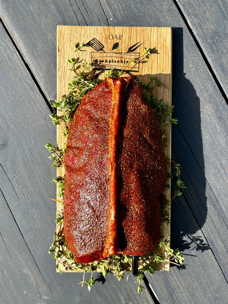 - Smeer het ree zadel in met een klein laagje olijfolie en verdeel hierover de WildFood Deer Rub naar smaak.