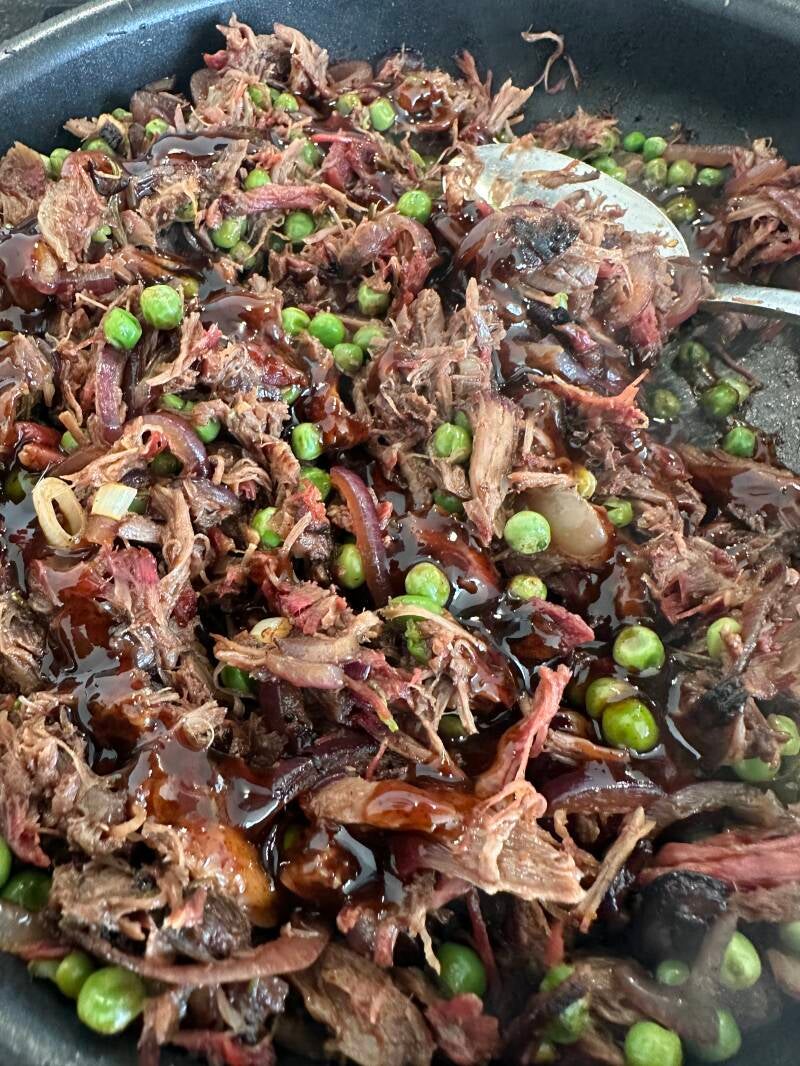 - Zet het vuur wat lager en verdeel de doperwten door het vlees, breng het vlees ondertussen nog op smaak met je favoriete BBQ saus. Zorg er hierbij voor dat het vlees lekker smeuïg is en voeg nu als laatste de pompoen door het vlees mengsel.