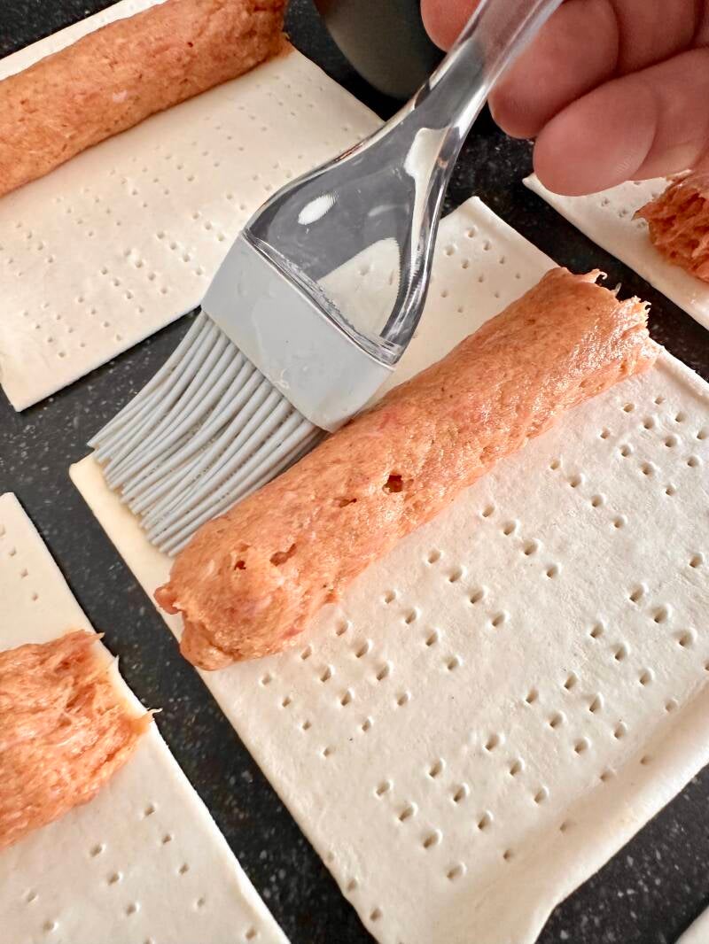 - Roer 1 ei nu los in een klein kommetje en strijk dit behulp van een kwast langs de vulling aan de bovenkant van het deeg zoals te zien is op de foto hierboven.