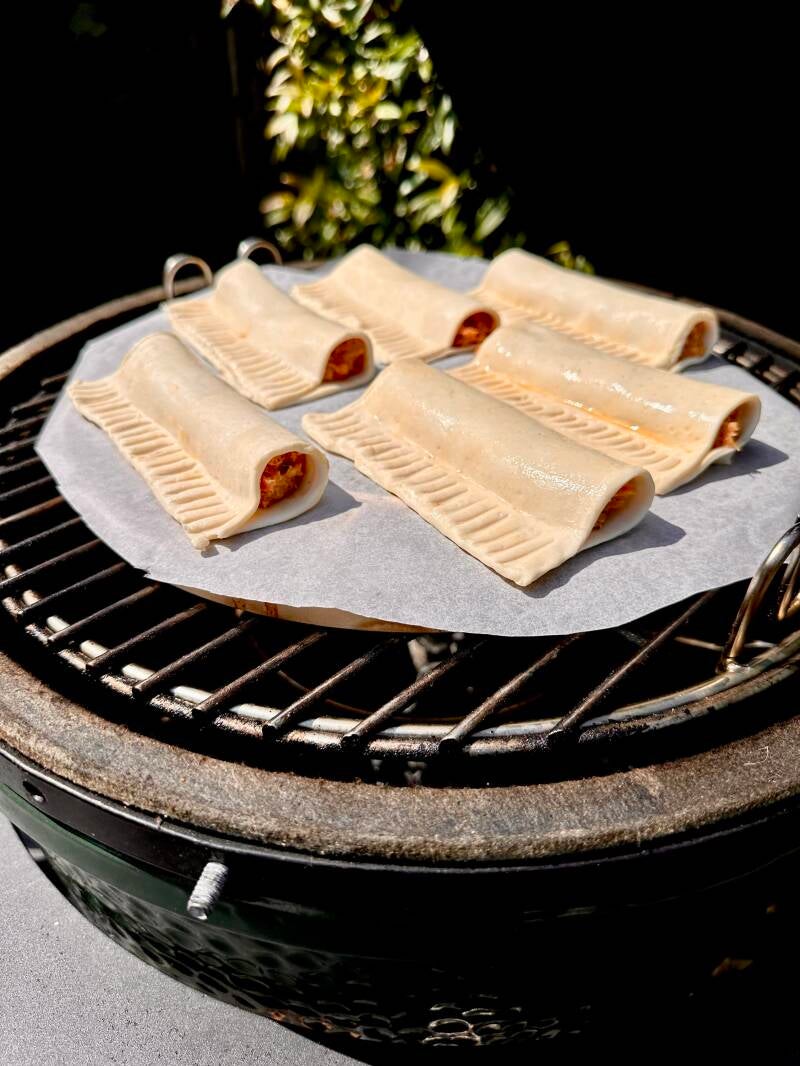 - Plaats de saucijzen broodjes nu op een bakplaat met bakpapier, bij het gebruik van een kamado leggen we de broodjes op een baksteen bekleed met bakpapier.