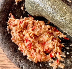 - Snijd de ingrediënten voor de boemboe fijn en maal deze fijn in de vijzel of met behulp van een mixer.